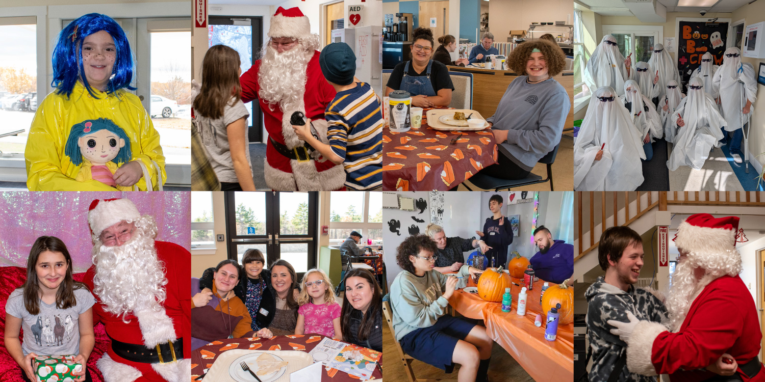 Collage of holiday and seasonal activities with kids, Santa, crafts, costumes, and pumpkin decorating.